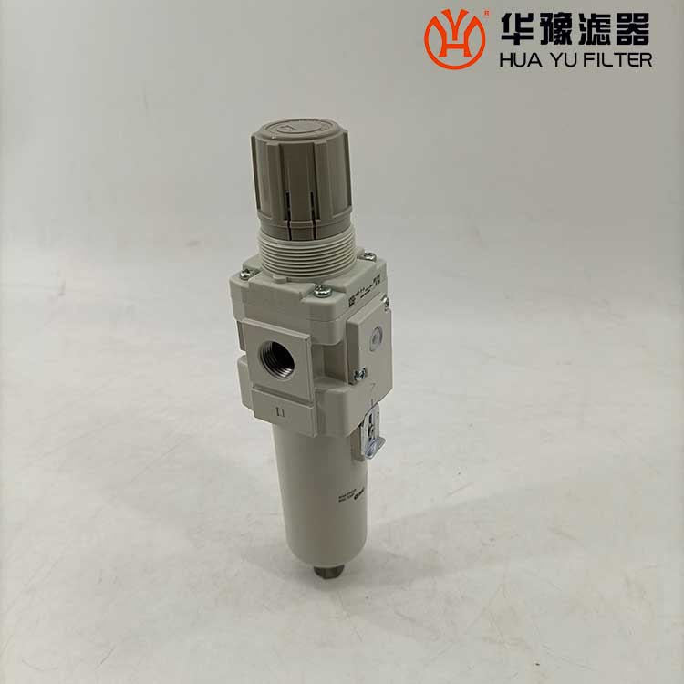 從進口流入的壓縮空氣,經導流片的切線方向的缺口強烈旋轉,液態油水及固態污染物受離心作用,被甩到水杯內壁上,再流至底部。除去了液態油水及雜質的壓縮空氣,通過濾芯進一步清除微小固態顆粒,然后從出口流出。 空氣中的溶膠狀的威力是能通過5um的濾芯的,擋水板能防止下部的液態油水被卷口氣流中,聚積在水杯內的冷凝水,按動手動按針,便可以從排水口指出。濾芯有金屬網型、燒結型和纖維凝聚型。燒結型有銅珠燒結、樹脂燒結和陶瓷燒結等。銅珠燒結濾芯的表面和內部都起到過濾作用,強度好,***,可清洗幾次重復使用。纖維凈聚型有樹脂類,人造纖維類材料等。金屬網型知識表面起到過濾作用。