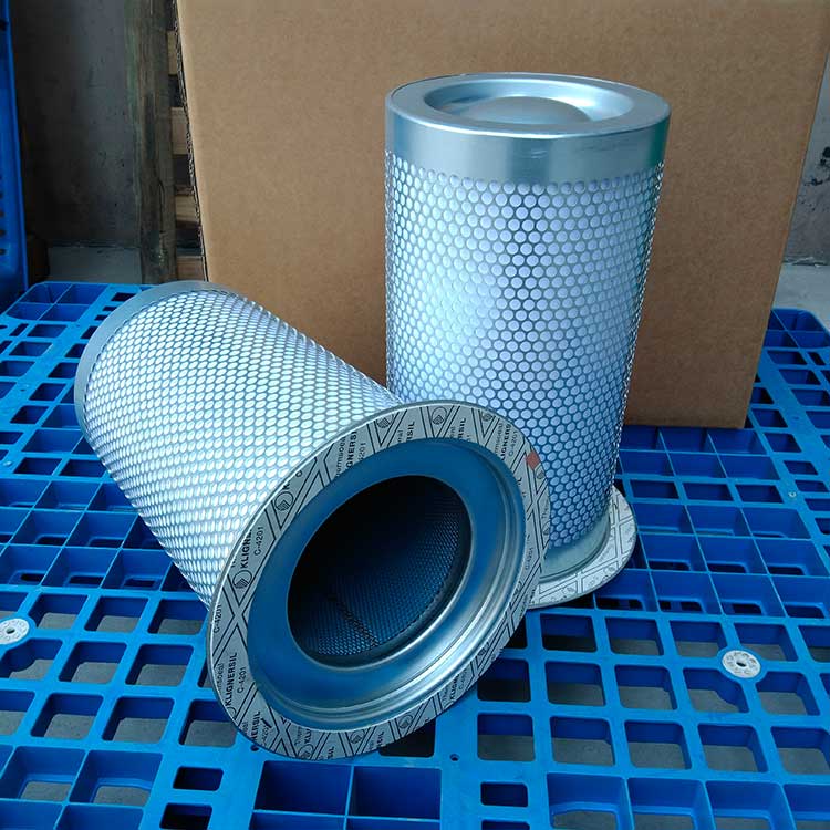 油氣分離元件是決定空壓機(jī)壓縮空氣品質(zhì)的關(guān)鍵部件,高質(zhì)量的油氣分離元件不僅可保證壓縮機(jī)的高效率工作,且濾芯壽命可達(dá)數(shù)千小時(shí)。從壓縮機(jī)頭出來的壓縮空氣夾帶大大小小的油滴,大油滴通過油氣分離罐時(shí)易分離,而小油滴(直徑1μm以下懸浮油微粒)則必須通過油氣分離濾芯的微米級(jí)玻纖濾料層過濾。油微粒經(jīng)過濾材的擴(kuò)散作用,直接被濾材攔截以及慣性碰撞凝聚等機(jī)理使壓縮空氣中的懸浮油微粒很快凝聚成大油滴,在重力作用下油凝聚在油分芯底部,通過底部凹處回油管進(jìn)口返回機(jī)頭潤(rùn)滑油系統(tǒng),從而使壓縮機(jī)排出更加純凈無油的壓縮空氣。壓縮空氣中的固體粒子經(jīng)過油分芯時(shí)滯留在過濾層中,這就導(dǎo)致了油分芯壓差(阻力)不斷增加。隨著油分芯使用時(shí)間增長(zhǎng),當(dāng)油分芯壓差達(dá)到0.08到0.1Mpa時(shí),或者壓縮空氣出口產(chǎn)生明顯的含油量時(shí),濾芯必須更換,否則增加壓縮機(jī)運(yùn)行成本(耗電或耗油)。